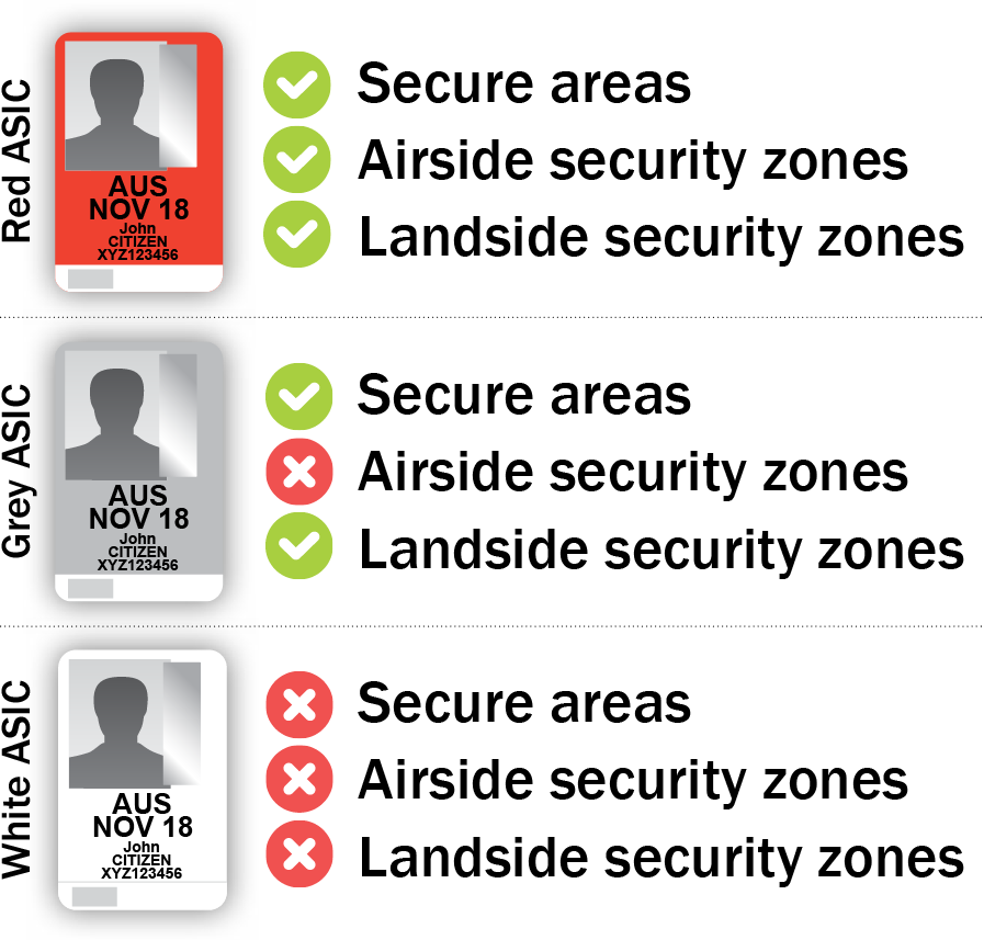 An ASIC is used to identify a person who has been the subject of a background check. A red or grey ASIC is required to obtain unescorted access to the secure areas (including the airside) of security controlled airports that have regular public transport (RPT) services. ASICs are valid for up to two years.